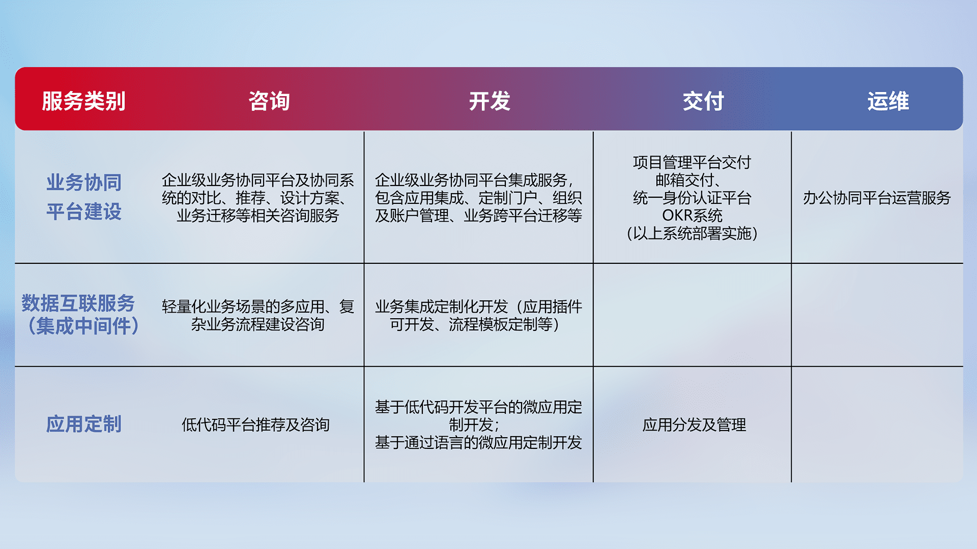 针对钉钉、、、、企微、、IDaas等平台级产品提供产品的规划、、方案、、交付、、定制化开发等服务,,实现如统一协同办公、、智能客户服务、、、混合会议管理、、、智能数据查询、、等业务场景,,,实现数字化转型。。。